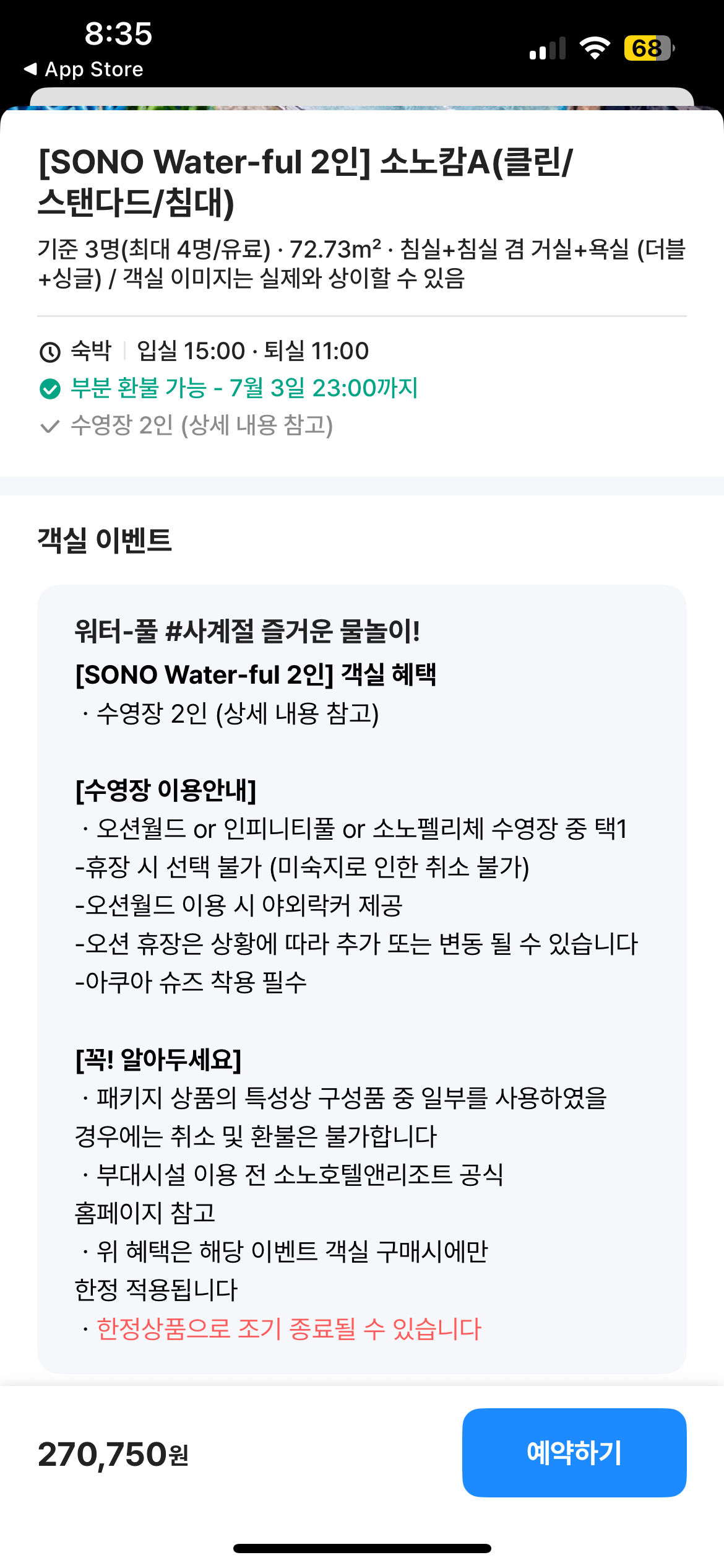 여기어때를 통한 비발디바크 소노캄 등 숙소 패키지 이용을 하는 것 또한 부대시설인 오션월드를 빼 놓을 수 없기에 할인된 가격에 이용할 수 있습니다. 이번에 전 객실패키지 소노캄 3인 1인당 오션월드 이용 시 1만원만 지불 후 이용했습니다. 현재도 해당 상품 판매되는터라 물놀이 후 숙박 예정으로 숙소와 함께 살펴보신다면 별도 오션월드 할인티켓 구매보다는 숙박 패키지에 포함된 구성으로 이용하는 편이 저렴한 가격에 이용할 수 있습니다.