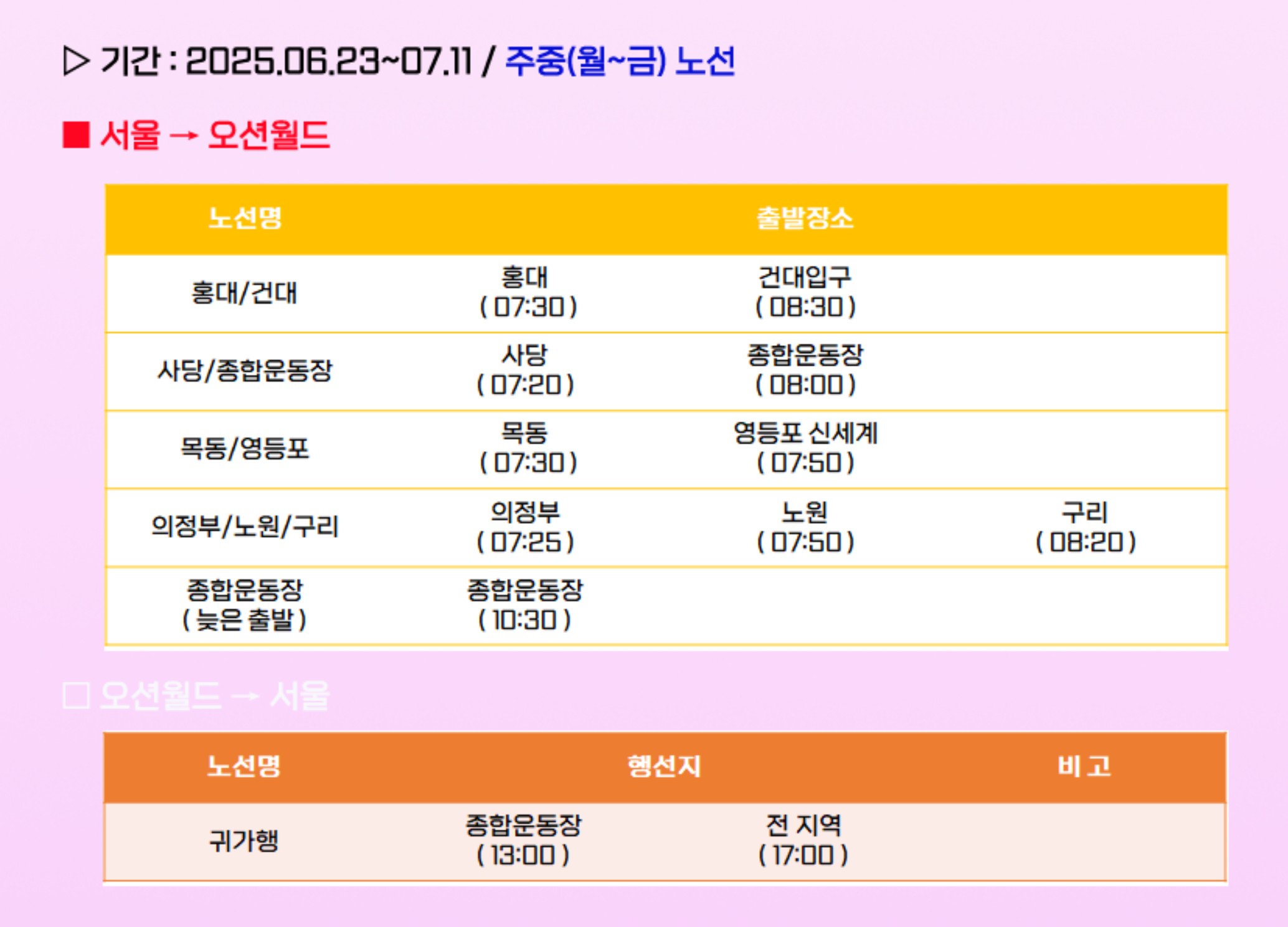 홍천오션월드는 강원도 홍천군 서면 한치골길 262(비발디파크 내)에 위치해 있으며, 차량 이동 시 내비게이션 ‘오션월드’ 또는 ‘비발디파크’로 검색. 차량 외에도 서울권의 경우 청량리역, 동서울터미널 등에서 출발하는 무료 셔틀버스도 운영됩니다. 아무래도 셔틀버스는 당일치기로 서울권에서 이동하기 수월하나 가족 또는 연인끼리 이동 시에는 서울양양고속도로를 이용했을 때가 오히려 접근성이 좋았습니다.